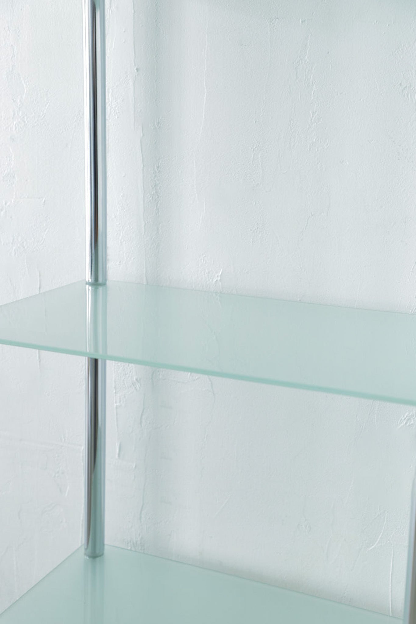 緑がかった乳白色ガラスの棚板とクロムのコンビ。